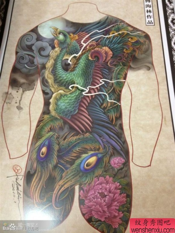 霸气很酷的一张满背彩色凤凰纹身手稿