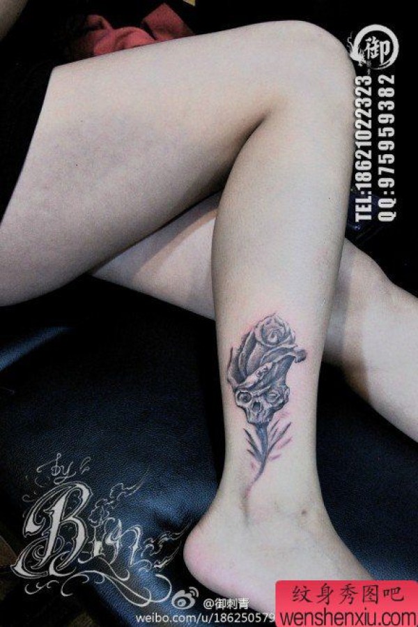 女生腿部一张另类经典的骷髅玫瑰花纹身图案