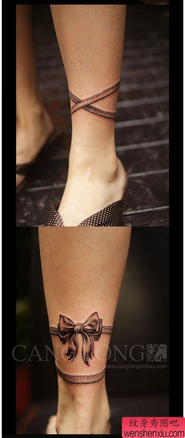 女生腿部漂亮时尚的蕾丝蝴蝶结纹身图案