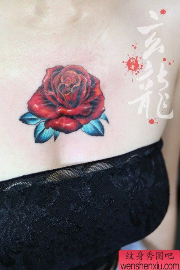 女生前胸漂亮时尚的彩色玫瑰花纹身图案