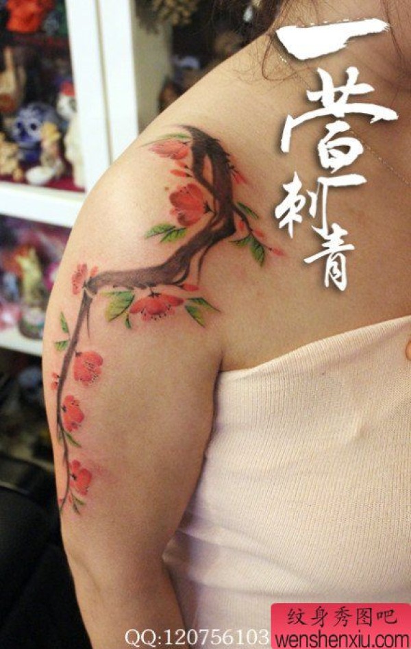 手臂漂亮时尚的彩色桃花纹身图案