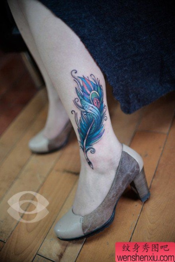 女生腿部漂亮时尚的彩色羽毛纹身图案