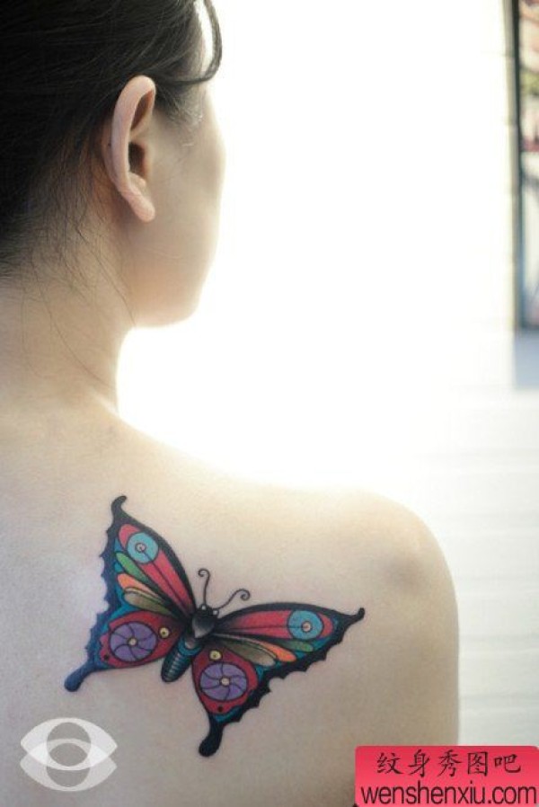 美女肩背漂亮时尚的彩色蝴蝶纹身图案