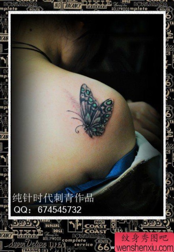 女生肩膀处小巧唯美的一张小蝴蝶纹身图案