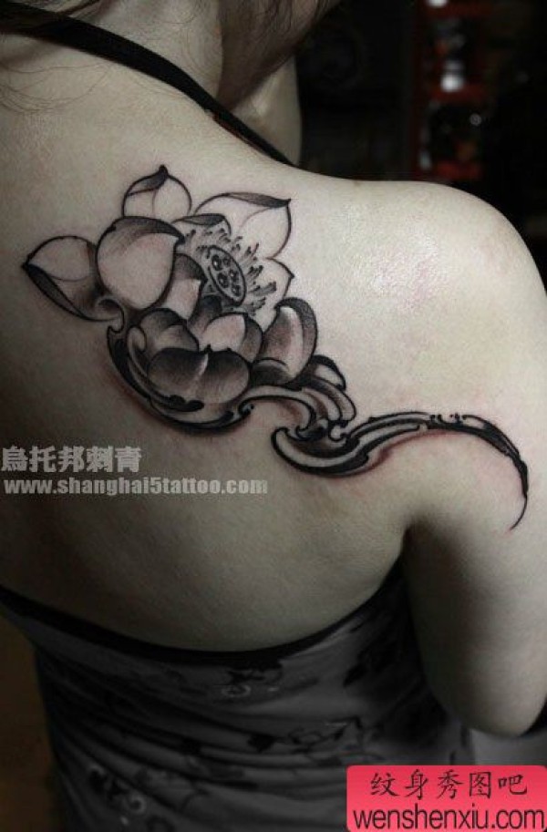 女生后肩背时尚唯美的黑白莲花纹身图案