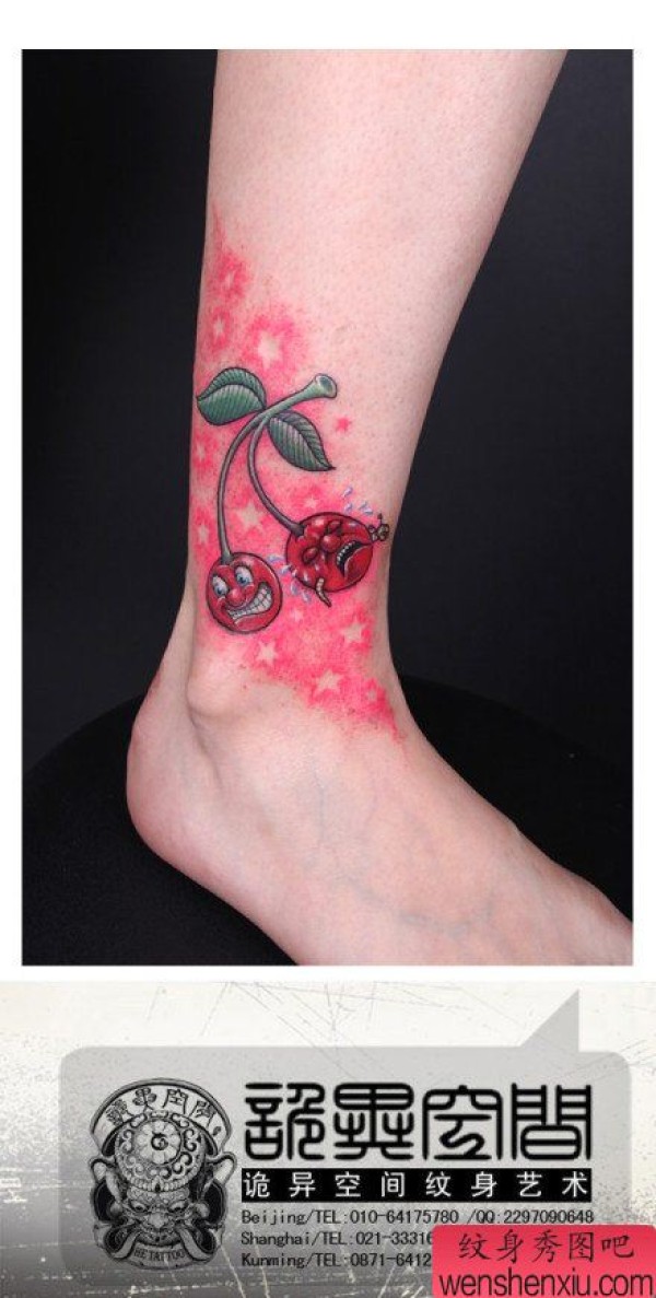 女生腿部经典的一张哭笑的樱桃纹身图案