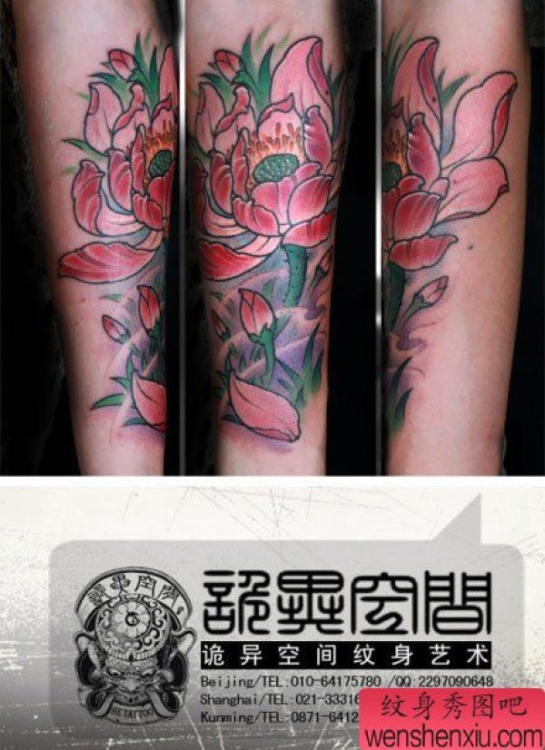 女生手臂漂亮时尚的彩色传统莲花纹身图案