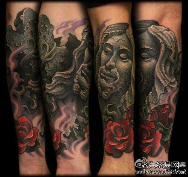 手臂经典时尚的一张石雕耶稣头像纹身图案