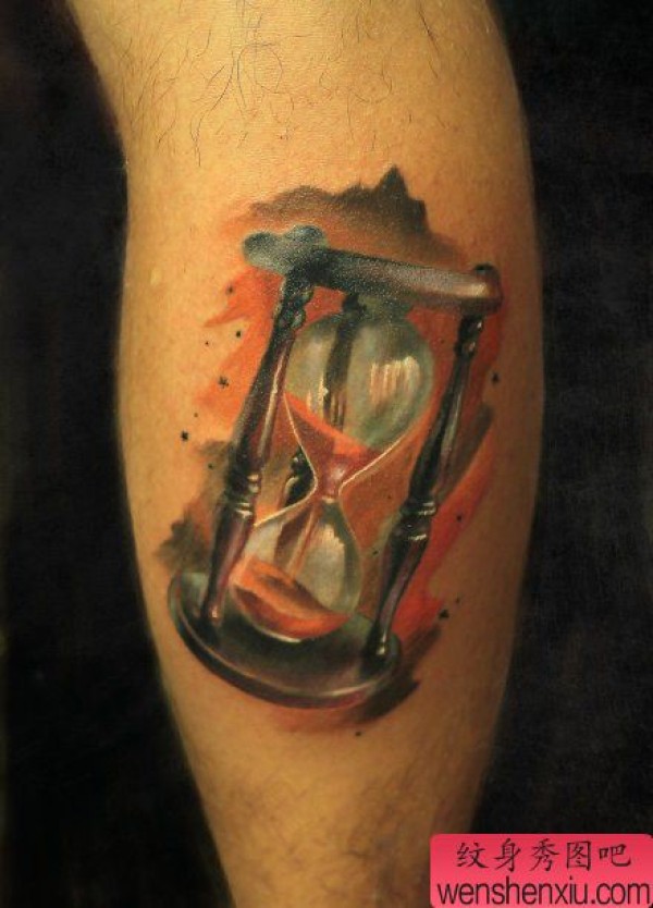 男士腿部经典时尚的一张欧美彩色沙漏纹身图案