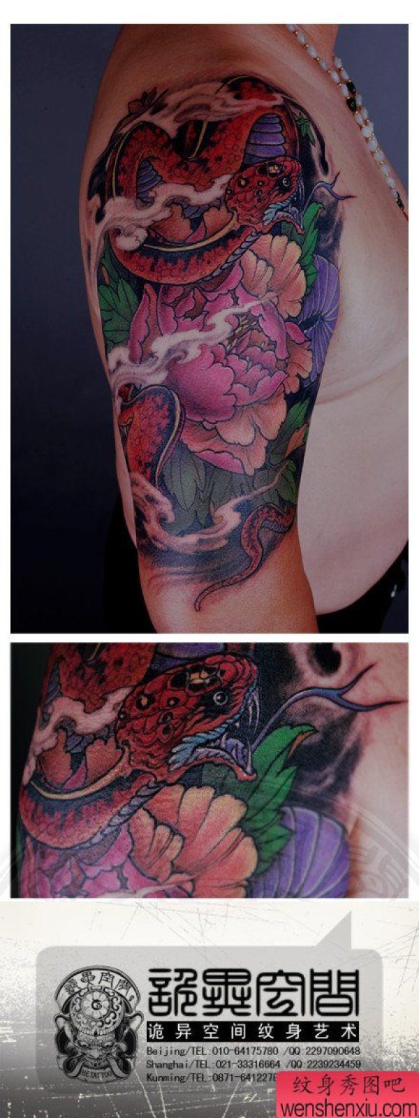 手臂漂亮时尚的彩色蛇与牡丹花纹身图案