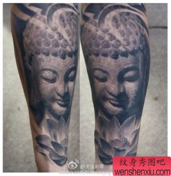 腿部经典的黑白石雕佛头纹身图案