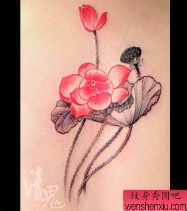 女生后背唯美时尚的彩色水墨莲花纹身图案
