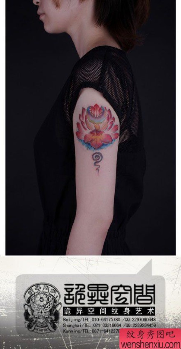 女生手臂漂亮唯美的彩色莲花纹身图案