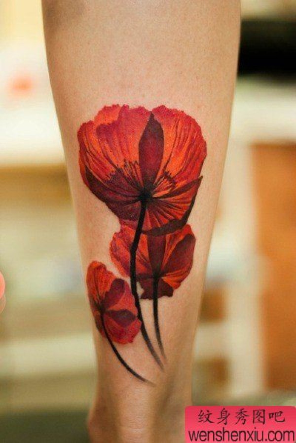 腿部漂亮时尚的罂粟花纹身图案