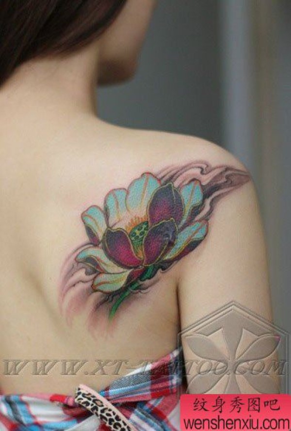女生后肩背唯美好看的传统彩色莲花纹身图案