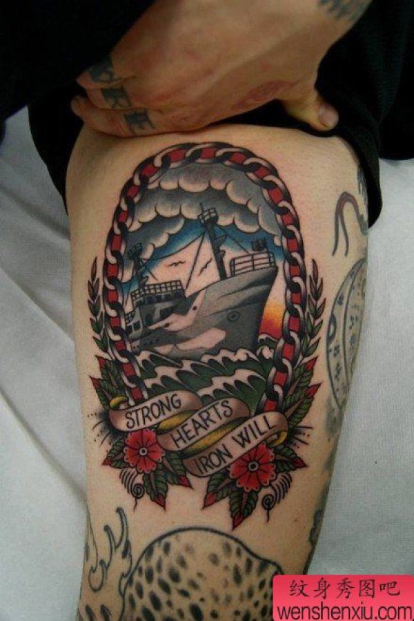 手臂内侧一张时尚经典的帆船纹身图案
