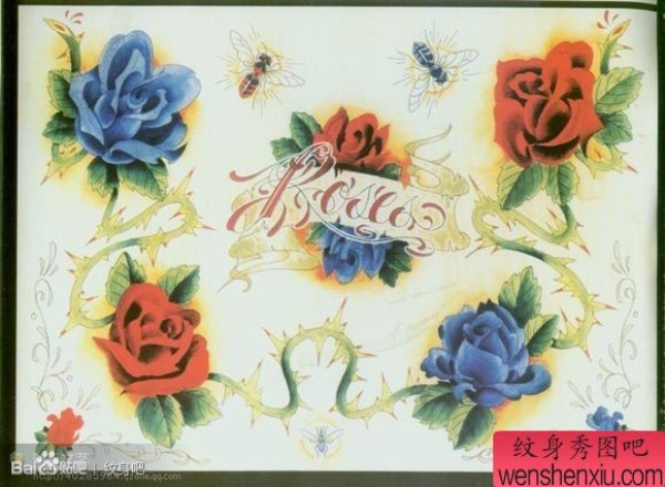 一套时尚时尚的彩色玫瑰花纹身手稿