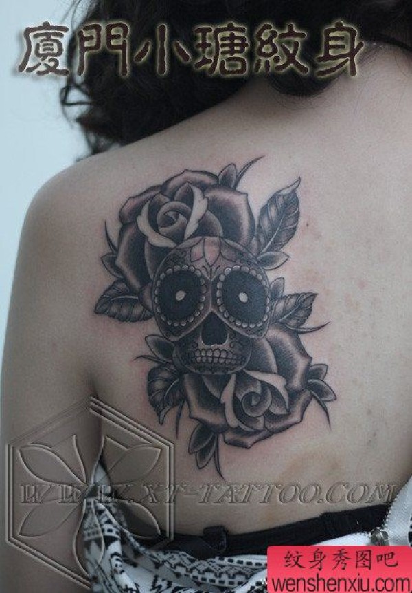 女生肩背唯美的黑白骷髅与玫瑰花纹身图案