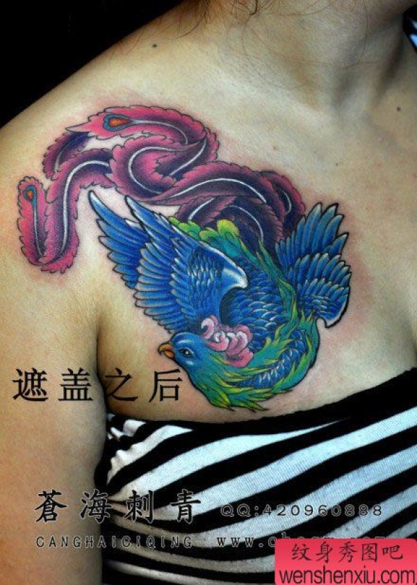 女生胸前时尚漂亮的传统凤凰纹身图案