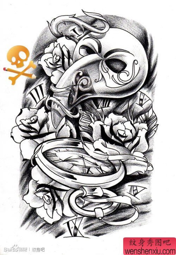 一张时尚唯美的怀表与玫瑰花纹身手稿