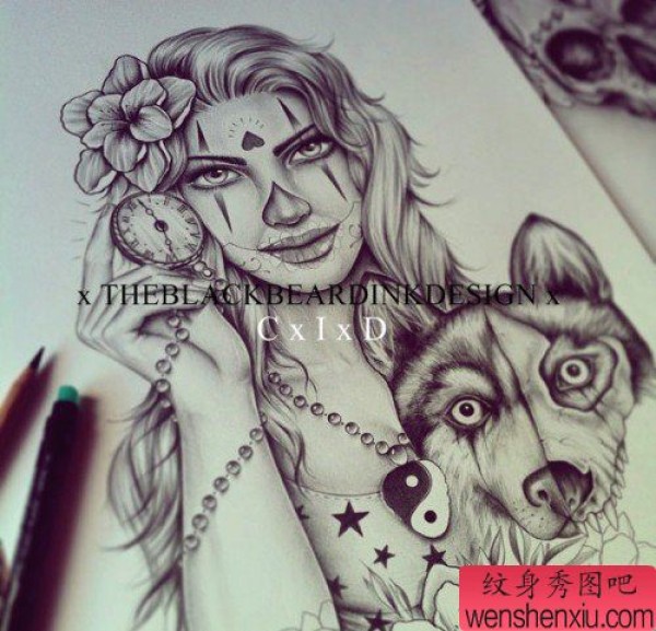 一张时尚唯美的亡灵装女郎纹身图案