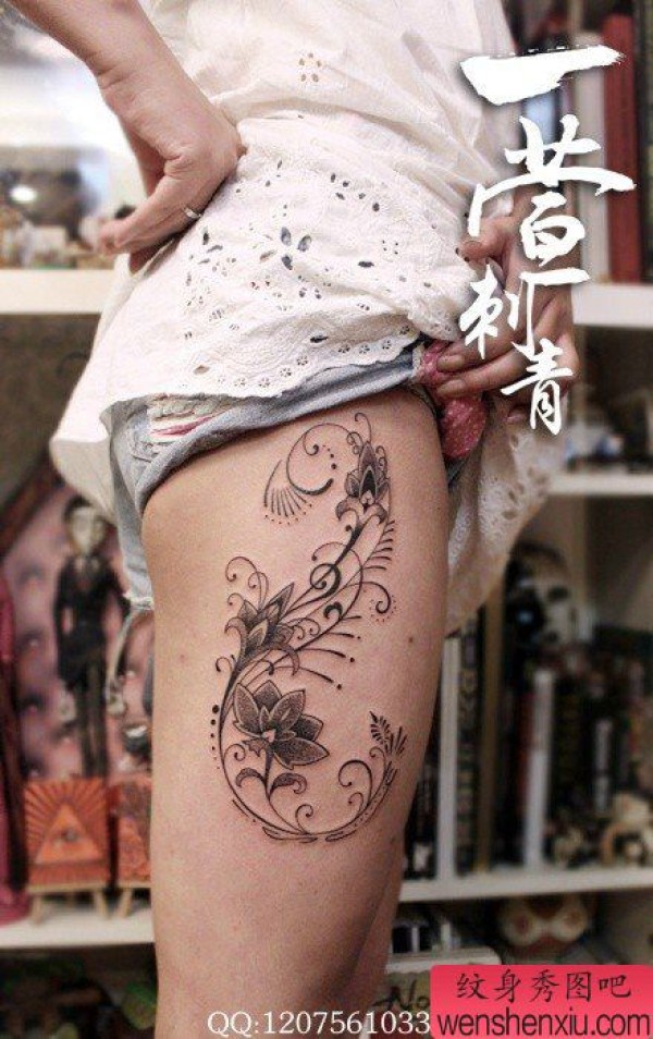 女生腿部时尚唯美的莲花藤蔓纹身图案