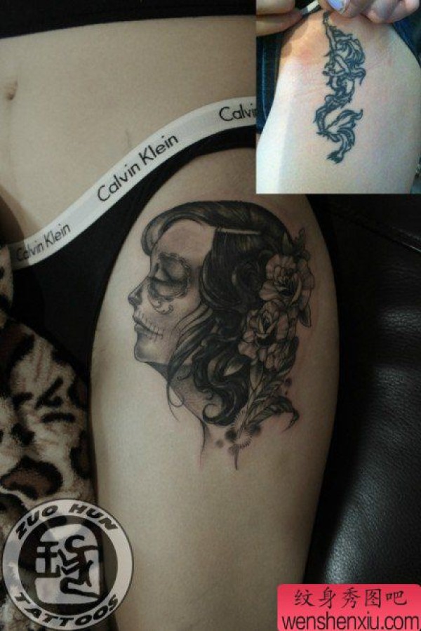 腿部时尚漂亮的亡灵装女郎纹身图案