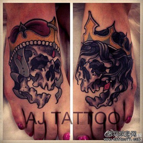 脚背时尚经典的黑白骷髅纹身图案