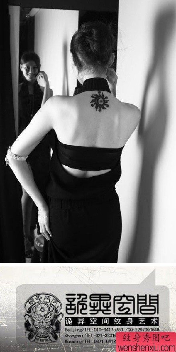 女生后颈部时尚经典的图腾太阳纹身图案