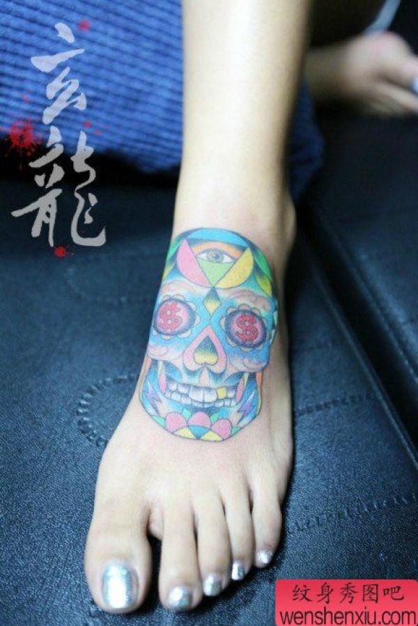 女生脚背时尚唯美的欧美骷髅纹身图案