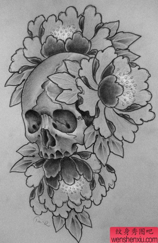 一张唯美经典的黑白骷髅牡丹纹身手稿