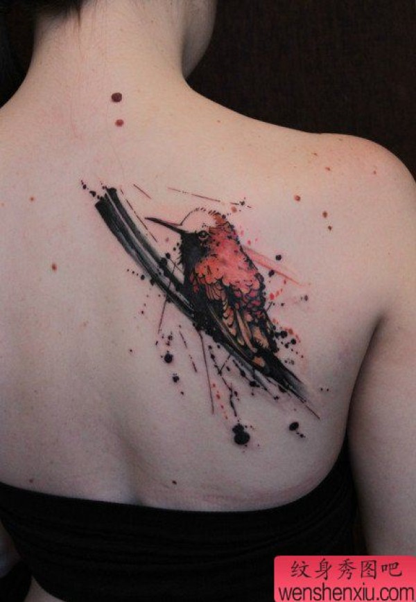 女生后背时尚漂亮的水墨蜂鸟纹身图案