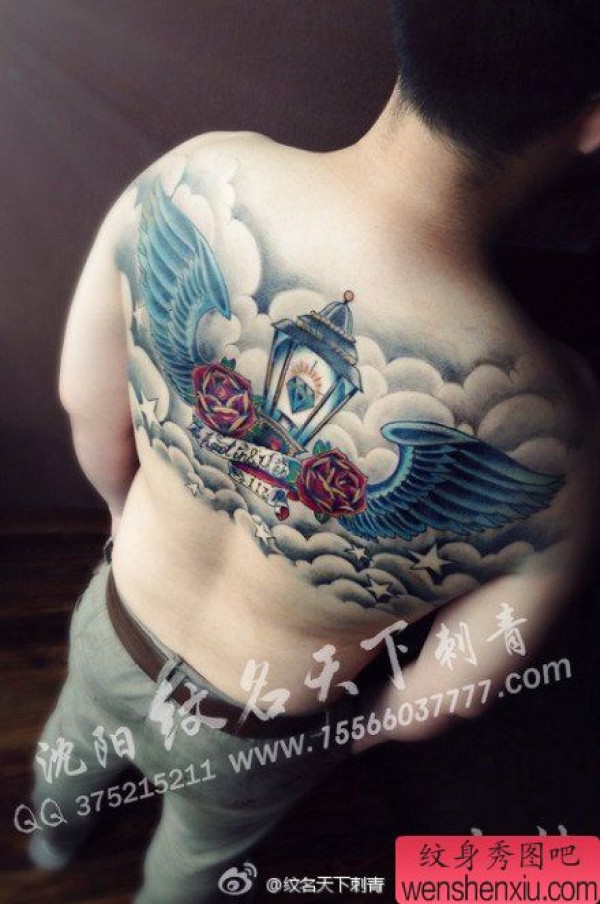 男生后背时尚精美的半背翅膀纹身图案