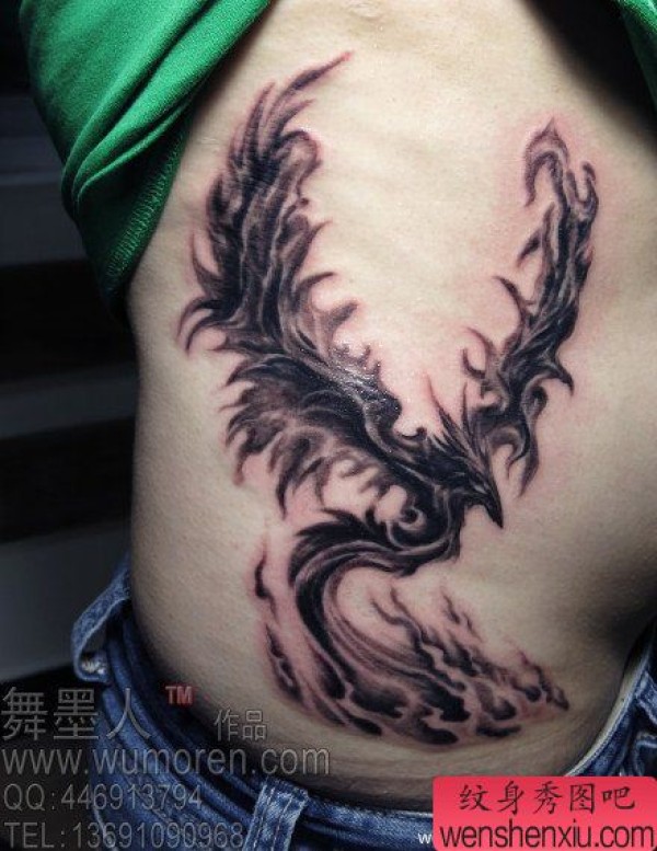 男士侧腰一张经典的黑白火凤凰纹身图案