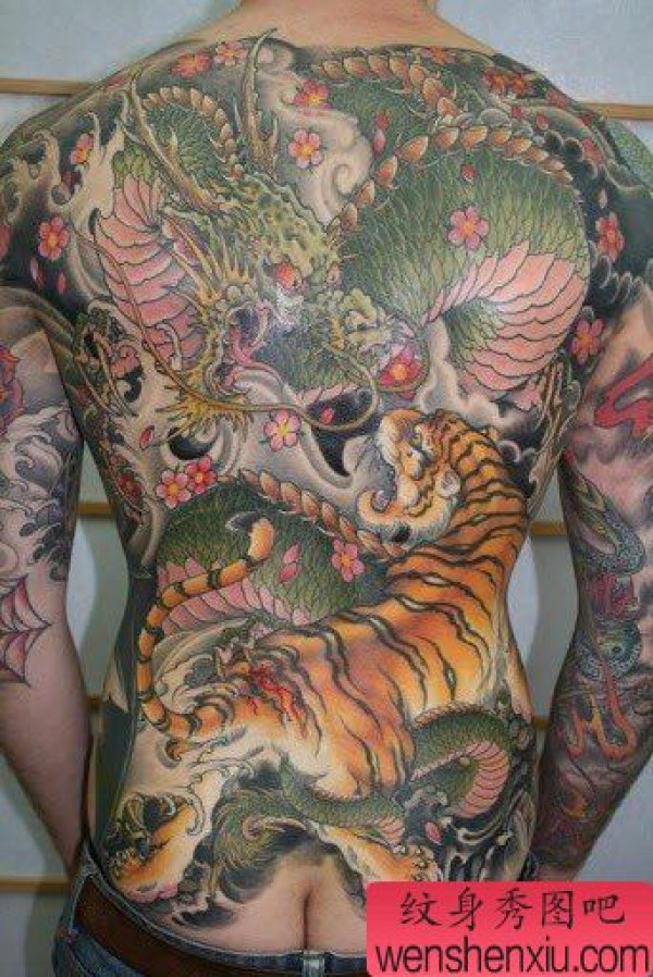 男士后背超酷霸气的满背龙虎争斗纹身图案