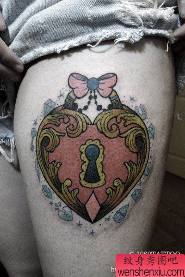 女生腿部精美时尚的彩色爱心锁纹身图案