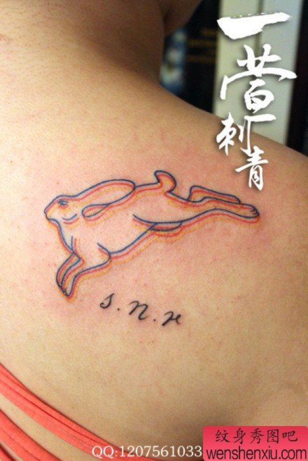女生肩背一张幻影小兔子纹身图案