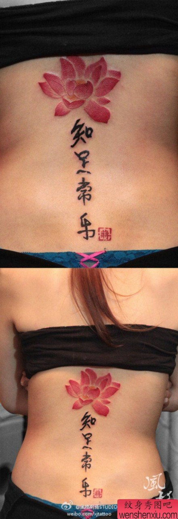 女生后背漂亮唯美的彩色莲花与书法汉字纹身图案