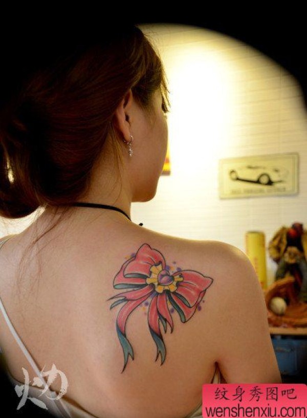 美女肩背时尚精美的彩色蝴蝶结纹身图案