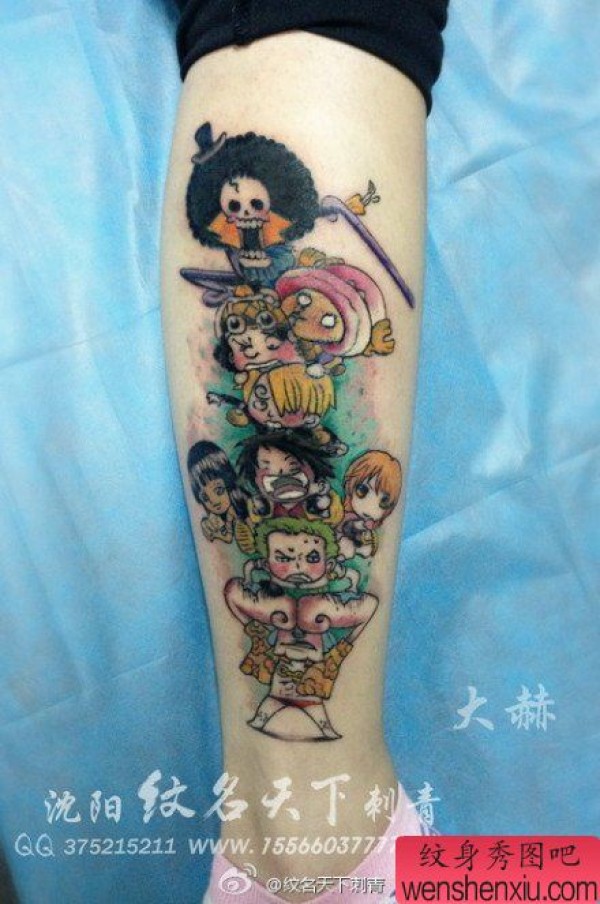 女生腿部可爱经典的海贼王草帽全体船员纹身图案