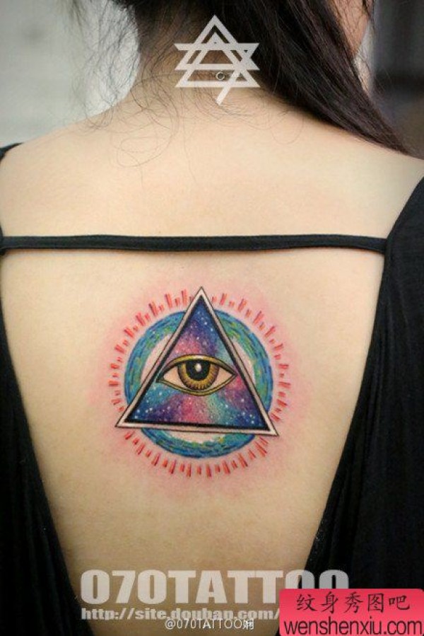 女生后背时尚漂亮的星空全视之眼纹身图案