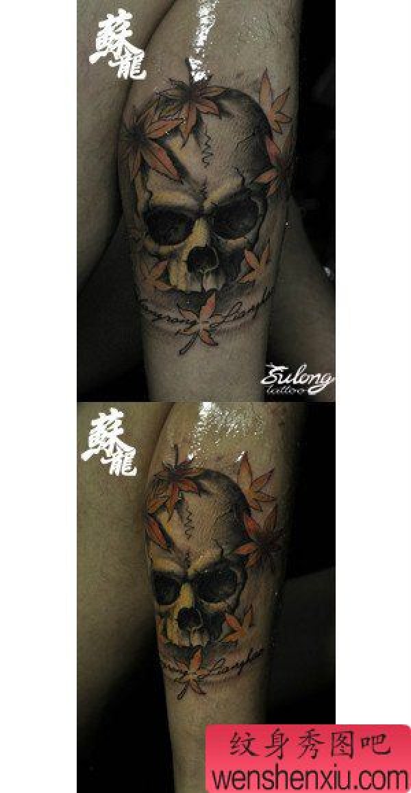 女生腿部唯美时尚的骷髅枫叶纹身图案