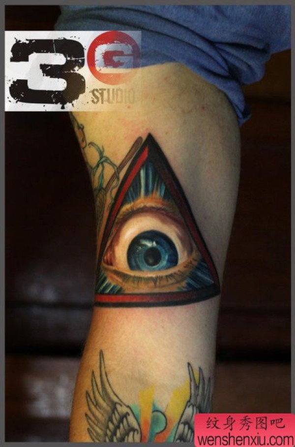 手臂内侧一张欧美3D彩色上帝之眼纹身图案