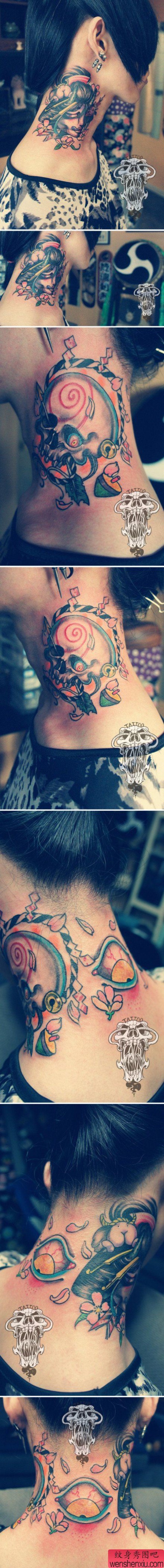 脖子处时尚经典的艺妓骷髅与眼睛纹身图案