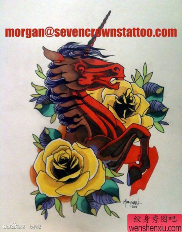 一张超酷精美的school独角兽纹身手稿