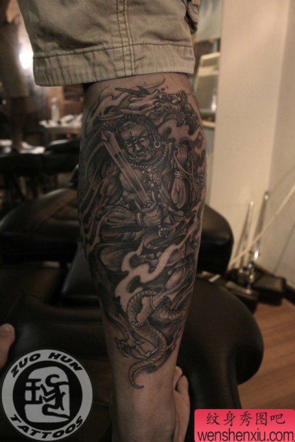 男士腿部超帅的黑白不动明王纹身图案