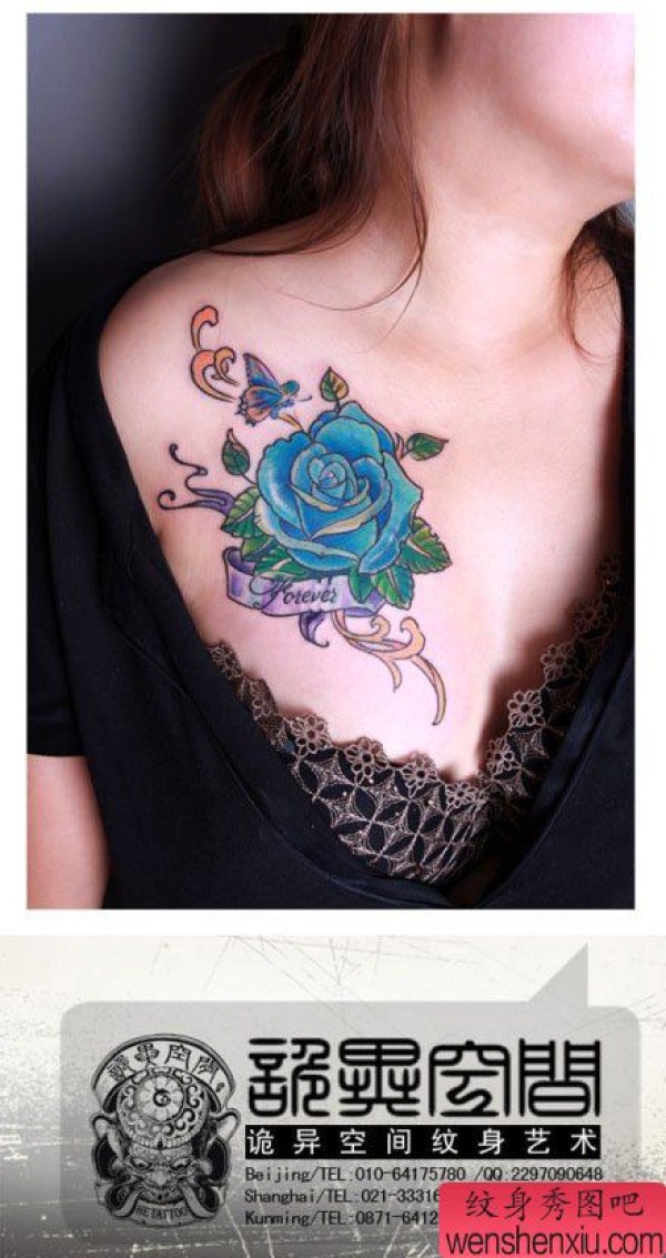 女生前胸时尚唯美的彩色玫瑰花纹身图案