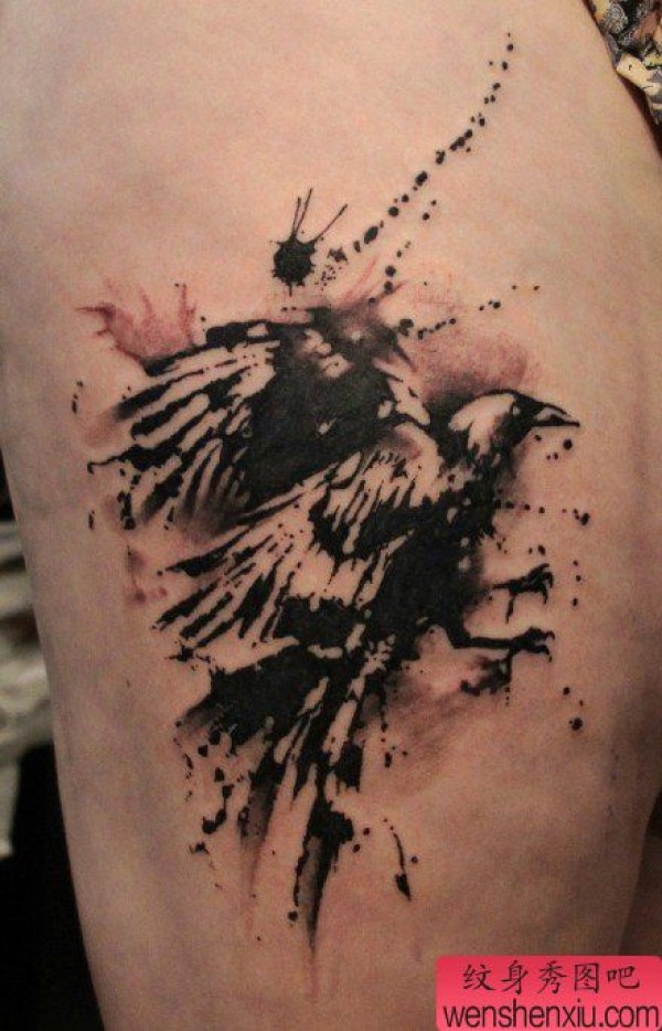 一张时尚经典的水墨风格的乌鸦纹身图案