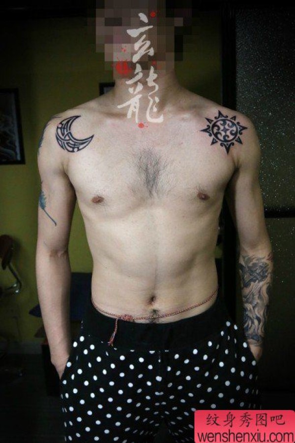 男士肩膀处经典时尚的图腾太阳月亮纹身图案
