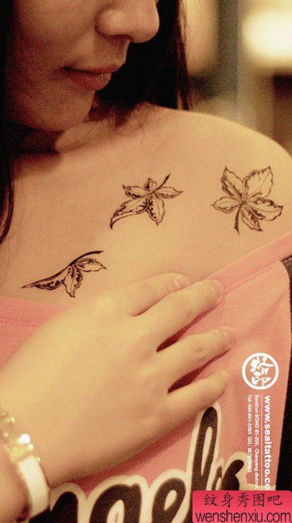 女生肩膀处时尚经典的图腾树叶纹身图案